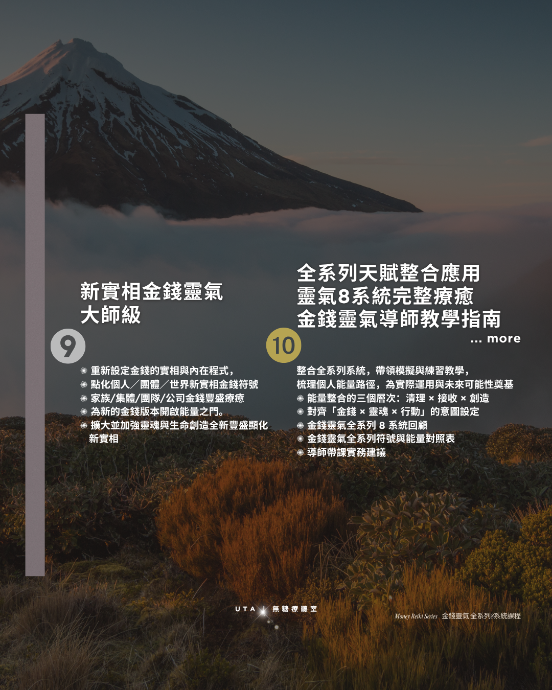 → 靈魂天賦整合、金錢能量評估、完整金錢靈氣療癒流程演練、帶領與實作教學基礎