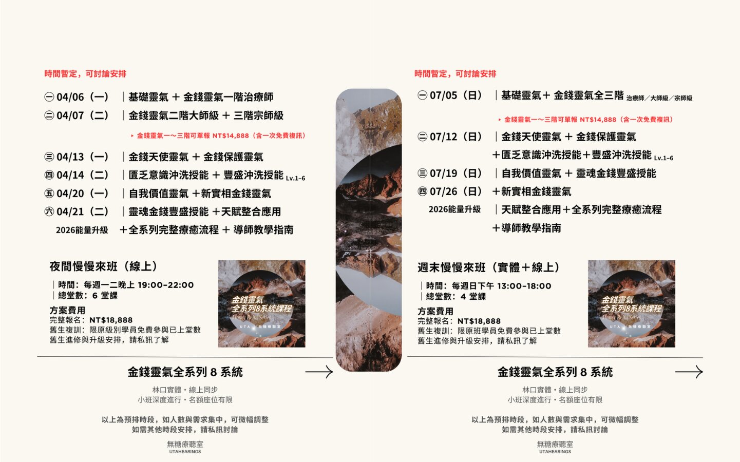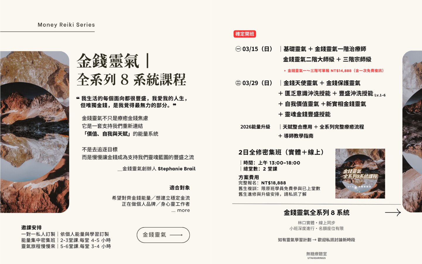 除了基礎三階,加入了金錢天使、自我價值靈氣、豐盛沖洗等 2–8 套擴充系統,並包含 2026 全新UTA專屬設計升級的「天賦整合應用」與「導師教學指南」。